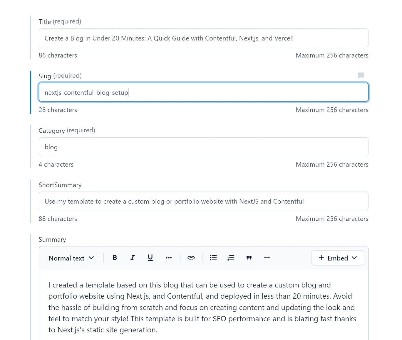 View of the contentful UI where I created this blog post